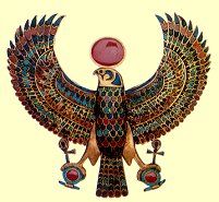 Falcons with protecting, outstretched wings were often painted on the ceilings of tombs and over temple doorways. This beautifully bejeweled falcon clutches ankhs and shen rings in its claws. Other falcon gods included Month, god of war, Re, the sun god and Sokar, god of mortuaries.