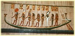 The papyrus paintings offered for sale to tourists, such as that shown here, often show scenes of the journey of an eminent person making his or her way towards eternal light and life through the underworld and of the final judgement which would decide if you were entitled to live in peace with Osiris or be condemned to have your heart eaten. The prominent figures in this painting are Osiris, the god of the underworld depicted in white, Horus the protector in the front of the boat wearing the sun disc on his head, and the pharoah who stands after Horus, wearing the crown of Lower Egypt. Accompanied by other gods and goddesses, all are sailing on a sacred boat called a barque towards the kingdom of life after death.
