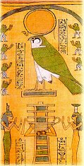 Osiris is represented in this picture by the djed pillar at the bottom, over which hovers a falcon with a sun disc, associated with his son Horus. The raising of the pillar is supposed to represent the victory of Osiris over Seth.