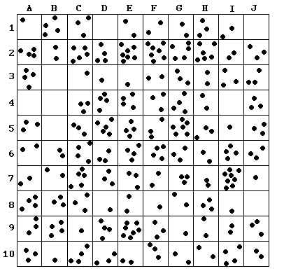 4. The grid below represents your study area. It is a field measuring 10 m on each side. Each of the grid segments is 1 m x 1 m. Each black dot represents a single sunflower plant.