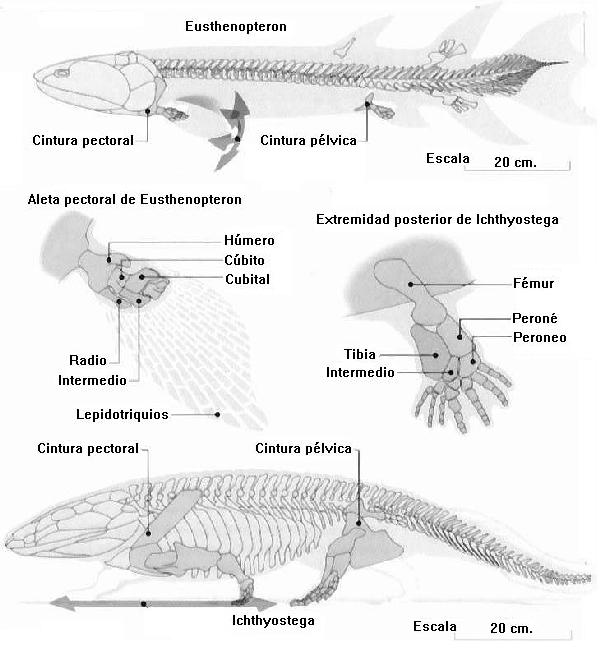 En el Devónico superior, hará unos 375 millones de años atrás, apareció el primer vertebrado terrestre conocido, llamado Ichthyostega. El Ichthyostega poseía extremidades bien desarrolladas con cinco dedos, así como todos los otros vertebrados terrestres. Las extremidades del Ichthyostega poseían una estructura esquelética consistente en un simple y largo hueso (llamado húmero en la extremidad delantera y fémur en la posterior) y dos huesos largos en la extremidad inferior (llamados radio y ulna en la extremidad delantera; y tibia y fíbula en la extremidad posterior). Los dígitos y "muñecas" están hechos de un gran número de pequeños huesos. Este patrón se encuentra también en todo vertebrado terrestre. Las pulposas aletas lobuladas de los peces Rhipidistios tienen una estructura ósea idéntica, que corresponde de manera unívoca con los esqueletos de las extremidades de Ichthyostega y otros vertebrados terrestres.