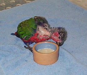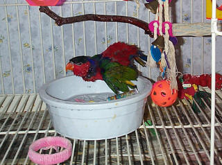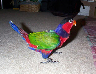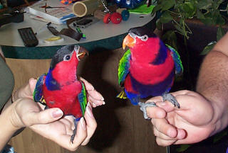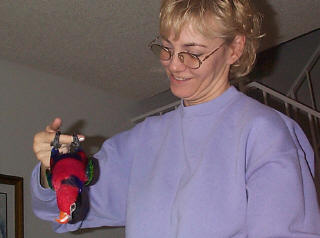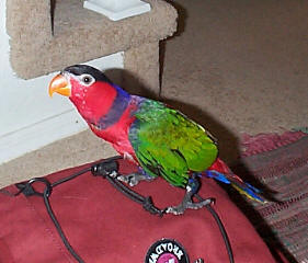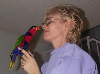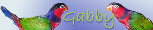 | About a year after Cosmo had come into our lives, we decided it was time to have another. I thought Cosmo's attitude was because she (who I still thought was a he) was lonely. My Best Friend, Darlene, Has bunches of Lories. One of which we both fell in love with, Melody. You can visit Melody and her family at HTTP://www.oocities.org/Petsburgh/4885 So we began our hunt for a little baby Black Cap Lory. Without mentioning any names, we became very frustrated with a few breeders we found. One was willing to give us an unweaned baby without caring that neither of us had any experience with handfeeding. This breeder's attitude was something to the nature of "Oh, I'll give you a quick lesson ?." We turned to our friend's at Birds of the World again, and once again - Brenda came through for us. She found us a little baby (not the one mentioned above) and we were able to watch her grow while visiting the store. When ready we brought this little Angel girl home. Our friends on Loryworld, who listened as we whined about our experiences and read patiently as we described Gabby in every detail while watching her grow and get weaned, threw us a little baby shower. Gabby is an interesting one, to say the least. She sleeps upside down, she eats everything in sight, and she talks up a storm. Jason has said to me when she's quiet, to watch what I say because she has her recorder on. And how true he was. She has even learned to call the puppies and get them into trouble for being too near the cages. There's no way to count the number of words in her vocabulary, as she learns something new everyday. We also found out while visiting her at her "nursery" that she is a sibling of Melody. See, good things do happen when you're patient. The lessons learned while looking for a Black Cap were that there are many, many people out there who just push and push their breeders to no limits. Choose you breeder carefully. While I don't recommend buying birds from Chain Stores, we're fortunate in that we have a store like BOTW, where the owners pick and choose their breeders very carefully. Please, please reconsider buying from a fly-by-night breeder or store. The chances of getting a diseased bird are just too great to risk! |
