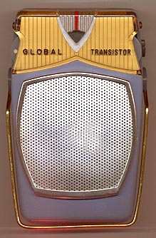 For cabinet design, its kinda silly and its kinda cool -- one of the truly classic reverse-painted plastic transistor radios. And note that the words, "GLOBAL" and "TRANSISTOR" are stamped on the outside face of the reverse-painted plastic -- this combination of surface-stamping and underpainting can be found on a number of other gorgeous radios, such as the Crown TR-555 and the Zephyr ZR-930, to name just two.