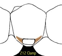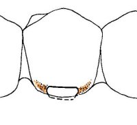 | Placement of the 212 retainer requires the facial beak to be placed 1.0 mm gingival to the anticipated gingival margin of the finished cavity preparation. The outline of the central portion is similar to that of the Class 5 preparation for amalgam: follow the shape of caries just deeper than the dentinoenamel junction with a minimal axial depth of 0.75 mm. The enamel decalcification is removed only to the dimensions and depth of the decalcification, leaving a sound enamel surface. |