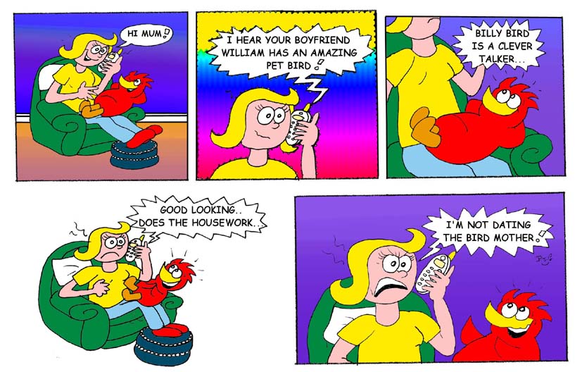 Billy Bird is a comic strip a bit like Garfield with a pet and a bit like Blondie with a dating couple also mixed in! I used what Jim Davis said...there are lots of dog strips so I'll do a cat strip...so I thought what is the 3rd best selling pet around the world....its not a rabbit...hamster..but its a bird!