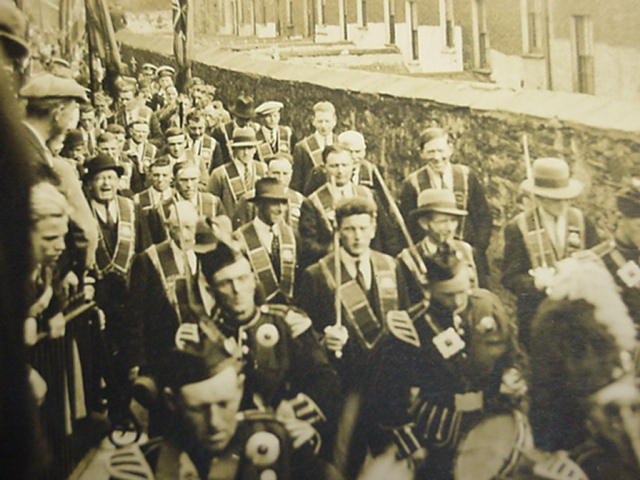 | Above is a photograph of Saintfield Mitchelburne Club on parade on Derry's famous walls on 12th August 1937 at the "Relief of Derry" celebrations. This was the first occasion that the club was to parade in the Maiden City. | ||||||||||||||