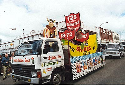 Shire's Fruiterers' float celebrating 125 years of European Settlement in Dannevirke, during the Dannevirke 125th Jubilee Parade, in the main street of Dannevirke (State Hwy 3) on Saturday, 11 October 1997. (Photo: Val Burr, P.N.)