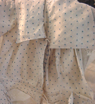 | This portion of the web site is designed to show how I create one of a kind doll fashions from discarded; mostly unwearable; antique and vintage summer weight garments. Each original piece is aired and examined carefully for damage, weakened areas or dry rot. All good pieces are kept and any usable fasteners, buttons and trim are salvaged to use on these or other creations. Large buttons are kept for hats. Any unusable portions are discarded but I try to find a use for everything, even the tiniest piece of lace or trim. |