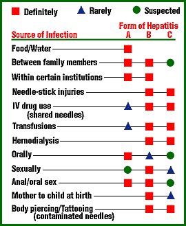 Direct percutaneous exposure is the most efficient method for transmitting HCV. In drug users, HCV infection is acquired rapidly after beginning injection drug use, with 50-80 percent of new users becoming positive for antibody to HCV within 6-12 months. Injection drug use accounts for half of all new infections annually and perhaps greater than 50 percent of chronic infections. In addition, it is thought that the majority of the rest of the cases can be explained by transfusion prior to 1990, occupational exposures to blood, hemodialysis, high-risk sexual activity (multiple partners, history of sexually transmitted diseases), and noninjection illegal drug use (intranasal cocaine). Percutaneous exposures such as body piercing and tattooing are potential sources of transmission if contaminated equipment or supplies are used, although their role in transmission of HCV in the United States has not been confirmed. It is now considered that the route of transmission is unknown in less than 10 percent of newly acquired cases of hepatitis C.