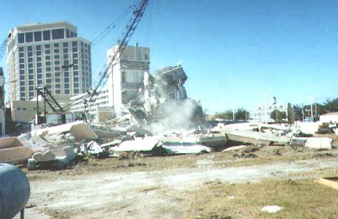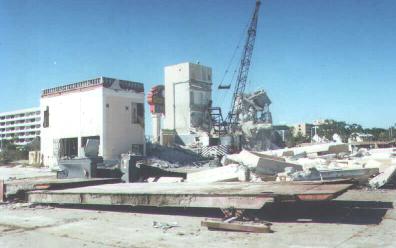 In August, 2001 we made one more lurk into the Gold Shore building before it was destroyed in October, 2001. Not only our final Lurk for truly a pretty cool after-midnight hangout, this was also our last lurk for a LONG time, following the events which transpired about two weeks later on 11 September. At left is the view of the property after the demolition. Below is a scene of the wrecking ball at work, largely the device implemented to remove this structure. At the top of our page is an original playing card, salvaged from the Gold Shore casino.