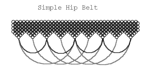 There are three basic elements of a chain belt; the main strip, the triangle dags, and the hanging loops. To build the main belt simply connect a number of rows (in this example there are seven) in a chain long enough to go around your waist, but not your hips. Try to make the number of rings in each row divisible by either 3, 4, or 5 (in this case, we use four). The dags are simply triangular expansions on the bottom edge of the main strip. The hanging loops can be nearly anything. I like to use chains of semiprecious beads. I connect every other dag with relatively short chains of gold tone chain with dark coloured fossil stone beads (chains shown as dark shaded lines). Outside the shorter chains I connect long chains of silver with light or translucent beads from every fourth dag (chains shown as gray lines).