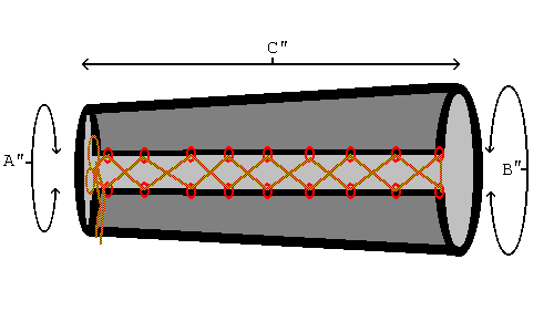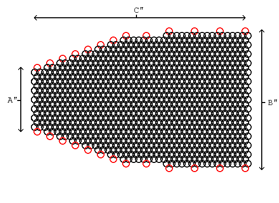 It is important to make sure that the chainmail tapers correctly such that the outer edges just meet along the entire length of the vambrace. In the illustration above, I have shown a vambrace that is tapered to fit my arm in particular. Most people will find that a more even tapering will fit better, I just happen to have thin wrists, but YMMV. Measurement A should be the circumference of the lowest part of the vambrace, while B is the highest. C is simply the straight line distance from A to B along the top of the arm. I have shown in red, extra rings which should either be doubled up, or welded shut. It is through these rings that the lacing of the vambrace shall go. A slightly more advanced design would involve the addition of a leather lining either worn separately underneath the vambrace or sewn into it. In any case, a certain amount of experimentation will be required to get the dimensions just right.