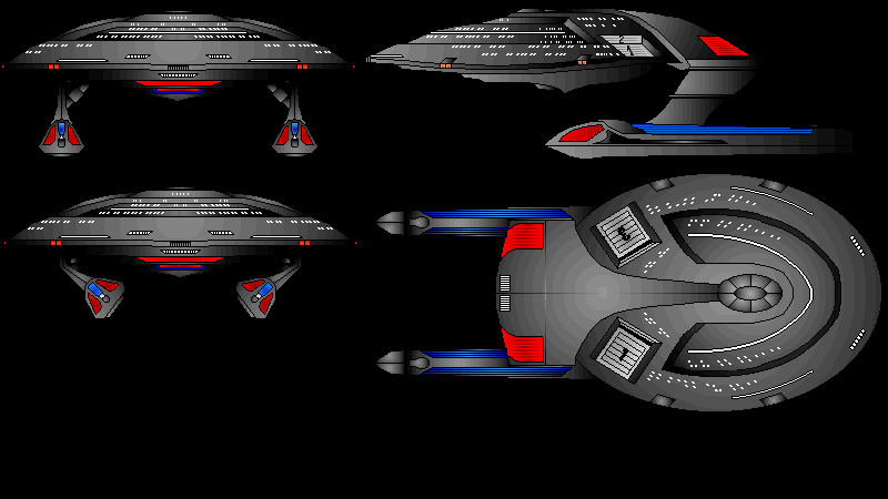 The Manta-class as seen above has been designed for the express purpose of fighting the Jem'Hadar. Many Galaxy-class starships have been destroyed by their powerful combatvessels. It is extremely maneuverable, fast and heavily armored. Four large weapon stations have been placed around the rim of the saucer section. Each contains 1 quantum torpedo launcher and 1 phaser cannon. Each station can rotate at a full 360 degree angle. The ship no longer needs to be in a frontal or rear position in relation to an enemy vessel to fire weapons. Thanks to new shielding technology, an increase of 44% was achieved in shield strength. Multi-layered shields have never been used on a ship this size. However, they have been implemented succesfully. Manta class starships are capable of separation. The Main Bridge separates with the Engineering section. The Engineering section has a concealed Quantum torpedo launcher only usable after separation. The Main Bridge serves as Battle Bridge but after separation, a secondary command centre is used to pilot the saucer section. This class also has 4 main shuttle/runabout bays. Bays 1 and 3 are the largest, capable of holding up to 30 shuttles or 10 standard runabouts. For special operation missions, 2 Defiant-class starships can be facilitated. Bays 2 and 4 hold up to 12 Everest-class light fighter craft. Installed is a Federation Cloaking device for use in the Gamma Quadrant. Unknown to the Romulans, Interphasic technology has been incorporated into the design. A newly developed Type-MXa starship mounted anyone emitter is being tested to counteract the cloak as it is believed the Romulans have also successfully integrated Interphase technology in Warbirds. Much of the technology used in the Sovereign-class, has been incorporated in the design.