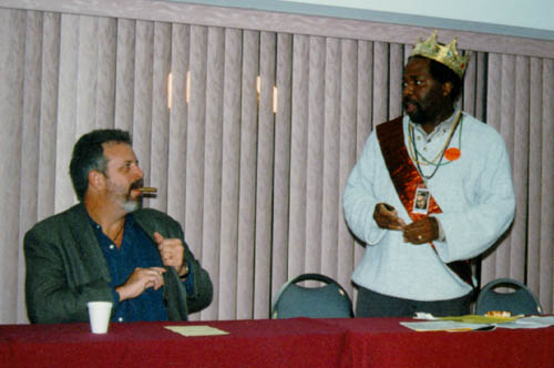 Alfred brings the joint MST3K and NOWFF panel to order. Kevin looks like he's ready for a smoke!