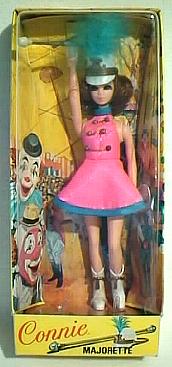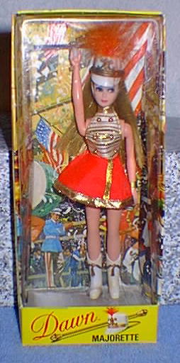 There were four majorette dolls: Dawn (of course...she's so talented that she can do anything!), Connie, April (the rarest) and Kip (the most common). They came with little hats with feathers on them, cute shiny uniforms, and glow-in-the-dark batons that fit perfectly in their hollowed-out hands.
