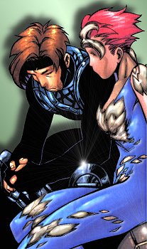 Uncanny X-Men #371 (8/99) - The pulse blast that sent the X-Men and their ship back into deep space caused them to enter stasis for another 7 to 8 days. As the X-Men wake up and begin to make their way back to Earth, Marrow ponders her new look. While Colossus lets her know how beautiful she is, Marrow doesn't know what to think or who she is anymore. However, she is happy for the compliment and even more happy that the pain is gone. She later forgives Gambit for injuring her with his charged card and lets him know that it is because of him that she has her new look. She thanks him with a hug as Gambit sits there with a guilty look on his face.