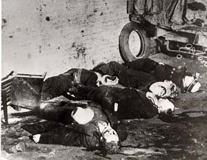 In 1929 Al Capone ordered Bugs Moran and his men killed. He nearly succeded. Half a dozen of Moran's men were in a warehouse waiting for a shipment of illegal whiskey. Johnny May, George Moran, a dog named Highball, Frank and Pete Gusenberg, James Clark, Adam Heyer, Al Weinshank and Reinhardt Schwimmer were inside. A police car pulled up outside. Bugs Moran himself was late for the meeting escorted by Ted Nuwberry. When he saw the police car he turned around and left. Four people got out of the police car witnessed by a landlady across the street. Two of the men were in police uniform, and the other two were in civilian clothing. Tremendous gunfire was heard followed by the men exiting the warehouse and departing in the car. Moran's men had been gunned down against the back brick wall. May , and Clark survived the attack as well as Frank. Frank died a short while later refusing to name his assailants. His infamous reply was "I ain't no copper." A canadian buisness man bought the bricks from the back wall when the warehouse was torn down to be sold as souvenirs. Legend has it that anyone who bought the bricks were beseiged by bad luck, and ruin. An occasional pedestrian in the area where the warehouse once stood reports hearing violent screams. Pets behave strangely in the area growling or barking furiously at nothing or wimpering. The warehouse once stood at 2122 North Clark Street. The lot is now the front lawn of a nursing home.