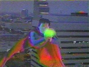 Back outside, Superboy watches as Luthor fires the duplicator ray into space. He follows the path of the ray until it nears the satellite. Once the satellite is in view, Superboy sends out a blast of super-breath, blowing the satellite out of the ray's path. The ray continues moving harmlessly into space. Superboy then follows the ray back to Luthor's lair. He breaks in through ceiling and lands in front of Luthor. "Don't you ever even think about using a door?" says Luthor. "It's midnight. I'm here." "So you are. Very prompt. And very brave, I might add, considering you know I've got the kryptonite. Gee I wish I could admire that. However this time I'm opting for a certain irony in having you meet your end at the hands of a, uh, friend." Bizarro steps out of the darkness holding a piece of kryptonite. Behind him a Bizarro-Lana appears. Now Luthor has come through for Bizarro and Bizarro feels he must hold up his end of the deal. Quickly, Lana appears also and rushes to Superboy's side. She tries to convince Bizarro that he is not a killer. Finally, Bizarro Lana speaks out telling Bizarro that Lana is right. "If you are a killer, me will not love you anymore." she says. Bizarro listens, and throws the kryptonite away. Luthor, realizing he's in trouble, runs into the back of the room with Darla. "Contingency plan, now!" he says. Suddenly, an army of Bizarro Luthors marches out toward Superboy and Bizarro. The two send Lana and Bizarro Lana away and watch as Luthor's plan backfires. Luthor notices the bizarro duplicates are smoking. "They're smoking. Didn't you treat them with the bizarro kryptonite?" he asks Darla. All Darla can say is, "No. I thought you were supposed to do that." The Bizarro Luthors explode one by one and the force of the explosions destroys Luthor's hideaway. Luthor and Darla disappear.