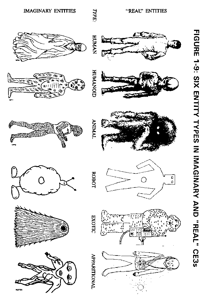 REAL AND IMAGINARY UFO ENTITIES Alien creature types will be discussed in a later section, so a few general observations will do for now. Descriptions of alleged UFO entities, which is one of the more elaborate Imaginary/real parallels, can be classified into six distinct types: human, humanoid, animal, robot, exotic, and apparitional. These categories are readily observed in worldwide folklore, mythology, and literary traditions, where the same classifications flourish. Every alien creature in abduction report literature fits one of these classes, and as we have pointed out above, all six CE3 entity types were described by our first eight Imaginary subjects. (See Fig. 1-9) Individual entities of each type may differ, but their classifications follow Earthly models unvaryingly.