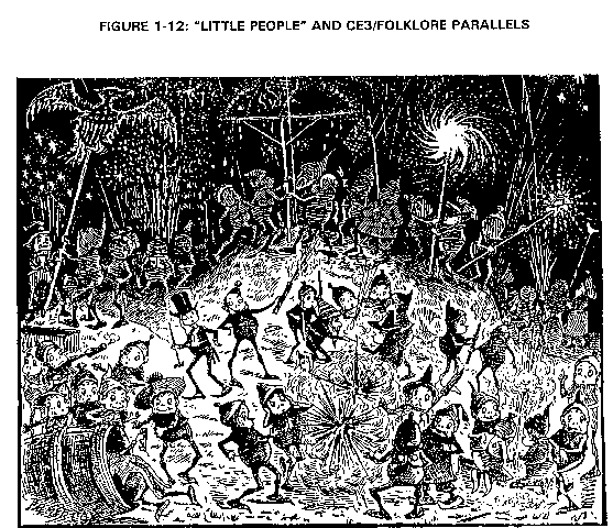 "LITTLE PEOPLE" ENCOUNTERS One of the richest sources of pre-1947 abduction lore is furnished by British, Celtic, and Scotch-Irish tales of "Little People" encounters (from the 4th century onward). This immensely diverse and abundant tradition contains many abduction parallels, among them bright lights, levitation, disappearing doors, some of the biggest big rooms (since the Little People supposedly conducted their activities mostly in underground caverns), and frequently a potent aftermath as well. Little People tales contain such perinatal patterns as fetal entities, changelings, a vast number of tunnel/tubes, and a rich mix of other birth imagery. As Fig. 1-12 shows, many Little People distinctly resemble a human fetus. Note the fetal appearance of brownies (i.e., pixies, leprechauns, elves, and many other similar creatures), including the diminutive stature, frail body, large head, ambiguous gender, skintight apparel, etc.