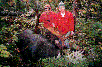 Each year I and my three brothers try to take a single moose (some years have not been successful, but that's ok!) When we do, the meat is shared equally between our four families. Usually we butcher for roasts and ground meat cut with a little beef fat (Moose is very lean, with almost no fat.) We try to take all our moose at close range for quick and effective kills. This moose was taken with a .308 Winchester at 37 paces (about 35 yards). We call our moose, a task that can take up to 12 or 14 hours. This bull came to us at 12:05 p.m. a little over 5 hours after we began calling. We are proud to say that the longest shot we have ever taken was 160 paces (150 yards). The closest was about 15 yards.