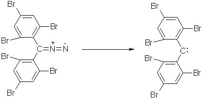 Electrophilic carbenes :CR1R2 with substituents R1 and R2 that are not electron donors were originally regarded as being too reactive to be isolated. As these triplet carbenes cannot be stabilized through thermodynamic effects, they have to be rendered unreactive by steric protection.(13) Considerable progress was made by Tomioka et al., who stabilized diphenylcarbenes with methyl or chloro substituents in ortho positions.(13) In 1995 they synthesized 2,2',4,4',6,6'-hexabromodiphenylcarbene by photolysis of the parent diazo compound. (fig. 2) In glassy and completely fluid 2-methyltetrahydrofuran, the compound is stable without significant decomposition.(13) Triplet carbenes exhibit radical-like reactivity