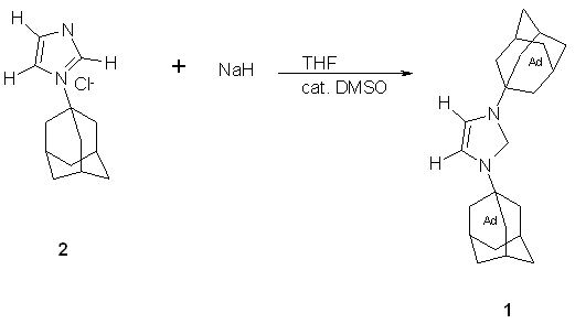 Carbene 1, 1,3-di-1-adamantylimidazol-2-ylidene was formed from the deprotonation of 1,3-di-1-adamantylimidazolium chloride (2) in THF at room temperature with catalytical dimsyl anion (-CH2S(O)CH3) in the presence of 1 equivalent of sodium hydride.(6) The deprotonation could have also been accomplished with potassium tert-butoxide in THF to give a 96% yield of 1.(6)