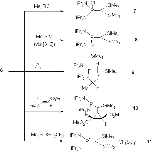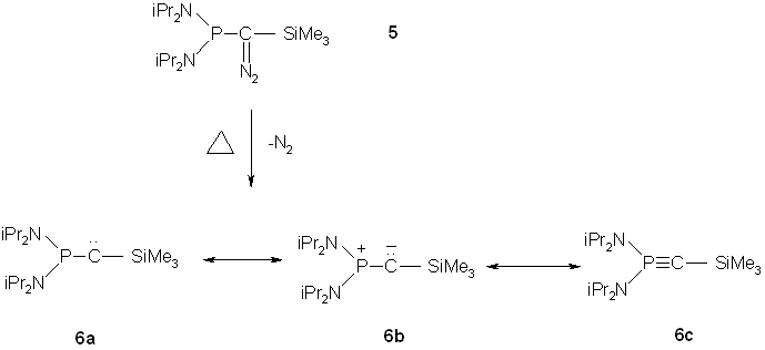 Bertrand was able to show that the thermolysis of [bis9diisopropylamino)phosphino](trimethysilyl)diazomethane (5) leads, after loss of nitrogen, to a stable compound 6 (1,1-Bis(diisopropylamino)-2-trimethylsilyl-1-phosphaacetylene).(10) While the NMR data and reactivity of 6 towards trimethylsilyl chloride, dimethyl sulfoxide and trimethylsilyl azide were characteristic for a phosphorus-carbon multiple bond, the carbene character of 6 was identified based on cycloproponation reactions, oxirane formation, and [1+1] addition to isocyanides.(11)