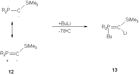 It has been shown by Bertrand et. al that the stable phosphanyl(silyl)carbene 12 undergoes formal 1,2-addition reaction with protic reagents as well as with Lewis acids, giving rise to the corresponding phosphorus ylides. Further, the reaction of 12 with alkylythium reagents leads to the lithium phosphonium ylide 13.(12)