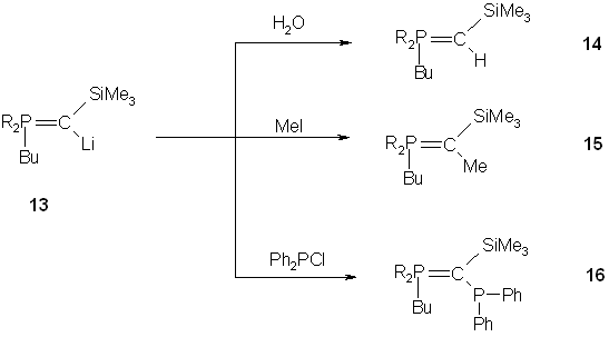 Compound 13 is highly moisture sensitive and is easily transformed into the corresponding phosphonium ylide 14. It also reacts at low temperature with electrophiles such as methyl iodide and chlorodiphenylphosphane to give the corresponding ylides 15 and 16 respectively.