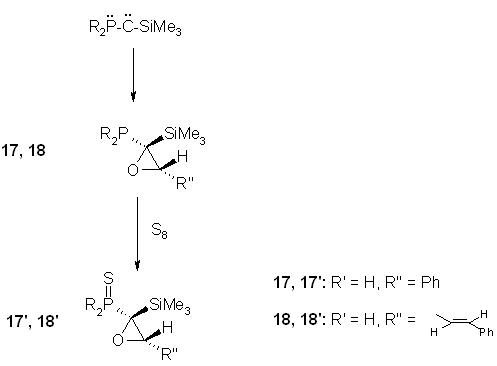 Electrophilic carbenes are also known to react with carbonyl groups through the oxygen lone pair to give carbonyl ylides (R2C=O CX2), which are usually characterized by [3+2] cycloaddition, but can even be isolated.(11) Compound 12 does not react with dimethyl ketone but readily adds to benzaldehyde and cinnamaldehyde, producing oxiranes 17 and 18.(11) After treatment with elemental sulfur, 17' and 18' were isolated in 80% and 82% yields respectively, as only one diastereoisomer.