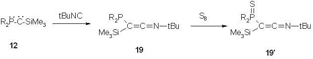 Carbene 12 also reacts with t-butyl isocyanide to give the corresponding ketene imine 19, which is isolated after sulfuration, as 19' in 90% yield.(11) The reaction of 12 to give 19 can be considered as a carbene-carbene coupling reaction.