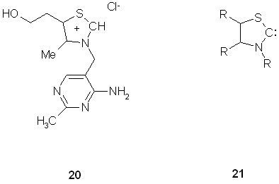 N-Heterocyclic carbenes acting as nucleophiles have manifold catalytic application in synthetic chemistry as well as in nature: Breslow showed in the context of ylidene-catalyzed benzoin condensations that the vitamin B1 enzyme cofactor thiamin (20), a naturally occuring thiazolium salt, plays a key role in biochemistry.(14) In basic aqueous buffers the active catalyst of this reaction is a 2,3-dihydrothiazol-2-ylidene, 21. (fig. 12)