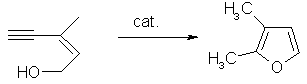 Carbenes are also used as catalysts in the hydroformylation of olefins, and in furan synthesis. The furan synthesis involves a ruthenium(II) carbene complex of the general type [Ru(p-cymene)Cl2L]. For example, in a catalytic reaction (Z)-3-methylpent-2-en-4-yn-1-ol is converted into 2,3-dimethylfuran.(14)