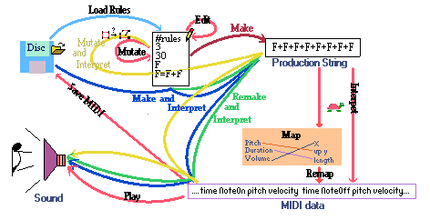 By itself, the production string is just a string of symbols. The production string is then 'interpreted'. That is, the symbols are mapped to drawing and/or music playing commands.