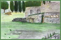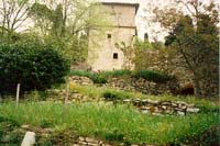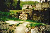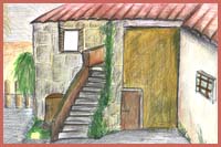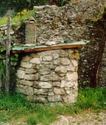 Vicino alla casa ci sono i resti di una costruzione in pietra non identificabile nella sua utilizzazione: magazzino per provviste, stanza da lavoro, abitazione, cappella? | La porta è in legno con cornice anch'essa in pietra, salendo le scale, si entra nella loggia, sotto di essa si trova una picola porta in legno che conduce alla cantina.
