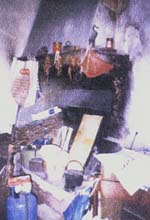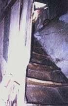 ![]() | Il soffitto è a stuoia, il camino ed il lavello in pietra. La scala che porta all'unica stanza superiore è in legno, la scala è, si può dire, chiusa da assi di legno che arrivano fino al soffitto e che la isolano in un proprio spazio. | ![]() |