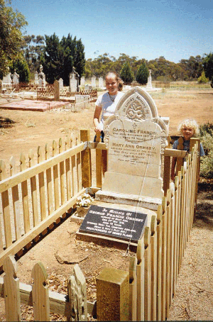 Both of Caroline's parents had passed on by this time. Her mother, Caroline, had died at Ninnes Plain in South Australia on Nov 20th 1881. Ninnes is a tiny hamlet on the Yorke Peninsula, approximately 125 km north west of Adelaide. The informant for the death certificate was George Francis Ormsby, a farmer of Ninnes Plain. He was Caroline's son-in-law. Her age was recorded as 83yrs. The grave is well tended and on my visit early in 1999 the headstone had recently been repaired and braced and a small picket fence erected around the grave.13