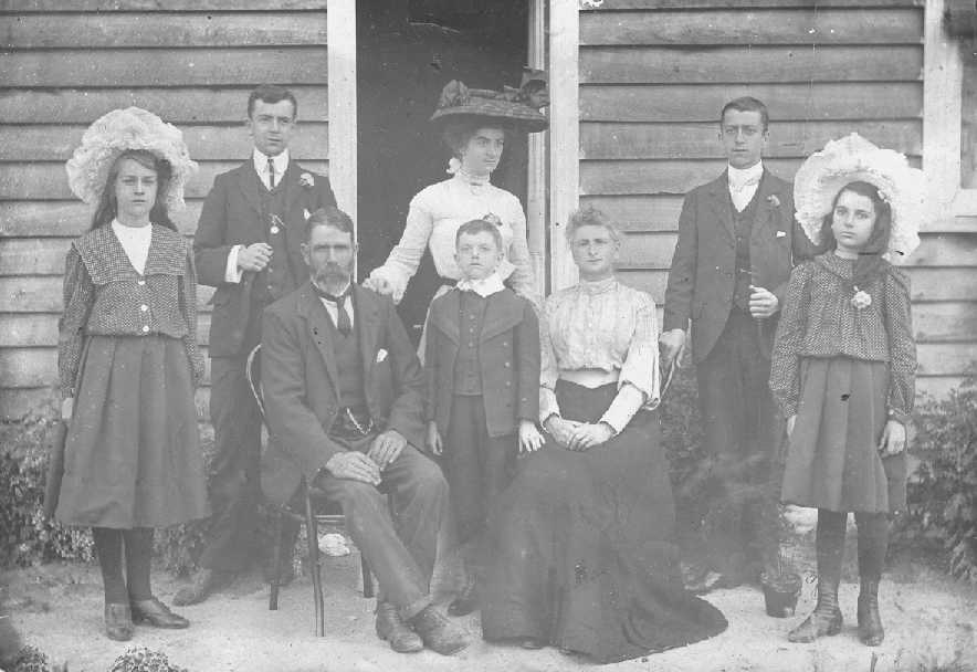 Photo taken about 1905 of the family of Thomas and Margaret Watkins at Katanning, WA. From left are Louisa Ann, Alexander Thomas, Thomas (seated) Mary Agnes (at rear), Thomas George (centre), Margaret (McDonald), seated, John Joseph and Annie Mary. Photo supplied by Thea Benson, a descendant of Mary Agnes.