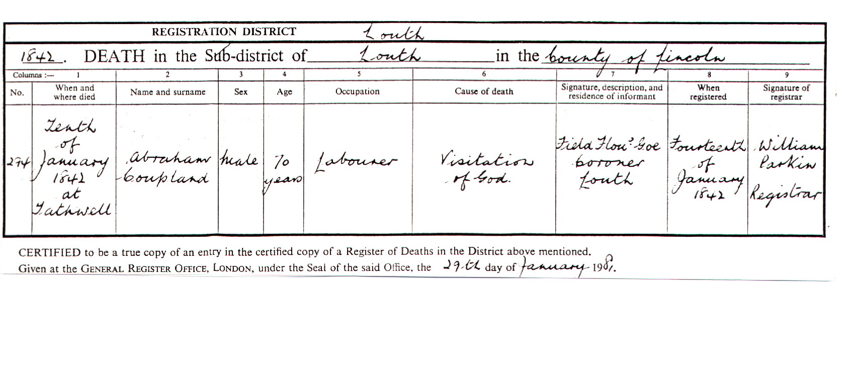 Almost five years before James Bond left England, an agricultural labourer from Lincolnshire named William Featherby landed at Portland Bay accompanied by his wife and family. The date was August 18th 1852.1 Probably similar reasons to the ones that later motivated James Bond led to his decision to migrate. William had been born at Caenby some 39 years before (April 21st 1812) and was the son of a farmer named David Featherby, and Elizabeth Hewitt.2 He married Jane Coupland (or Copland or Copeland - various spellings have been used in the different documents I have seen) at Tathwell in Lincolnshire on April 24th 1836. Jane had been born near Haugham in Lincolnshire and baptised there on Sept 10th 1815. She was the daughter of Abraham Coupland and Frances Thacker.3