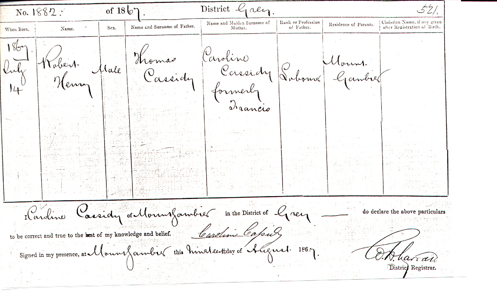 [3] Details regarding Samuel, Robert, Robina and Elvira derived from their respective birth certificates. The date of birth of Arthur was obtained from the enrolment records of the Mount Gambier school which recorded his attendance for twelve days at the commencement of 1885. According to the same records the occupation of Arthur's guardian James Spruce, was 'shepherd' and his usual address was Rosaville - a western suburb of Mount Gambier. Details suppled by Peter Cassidy