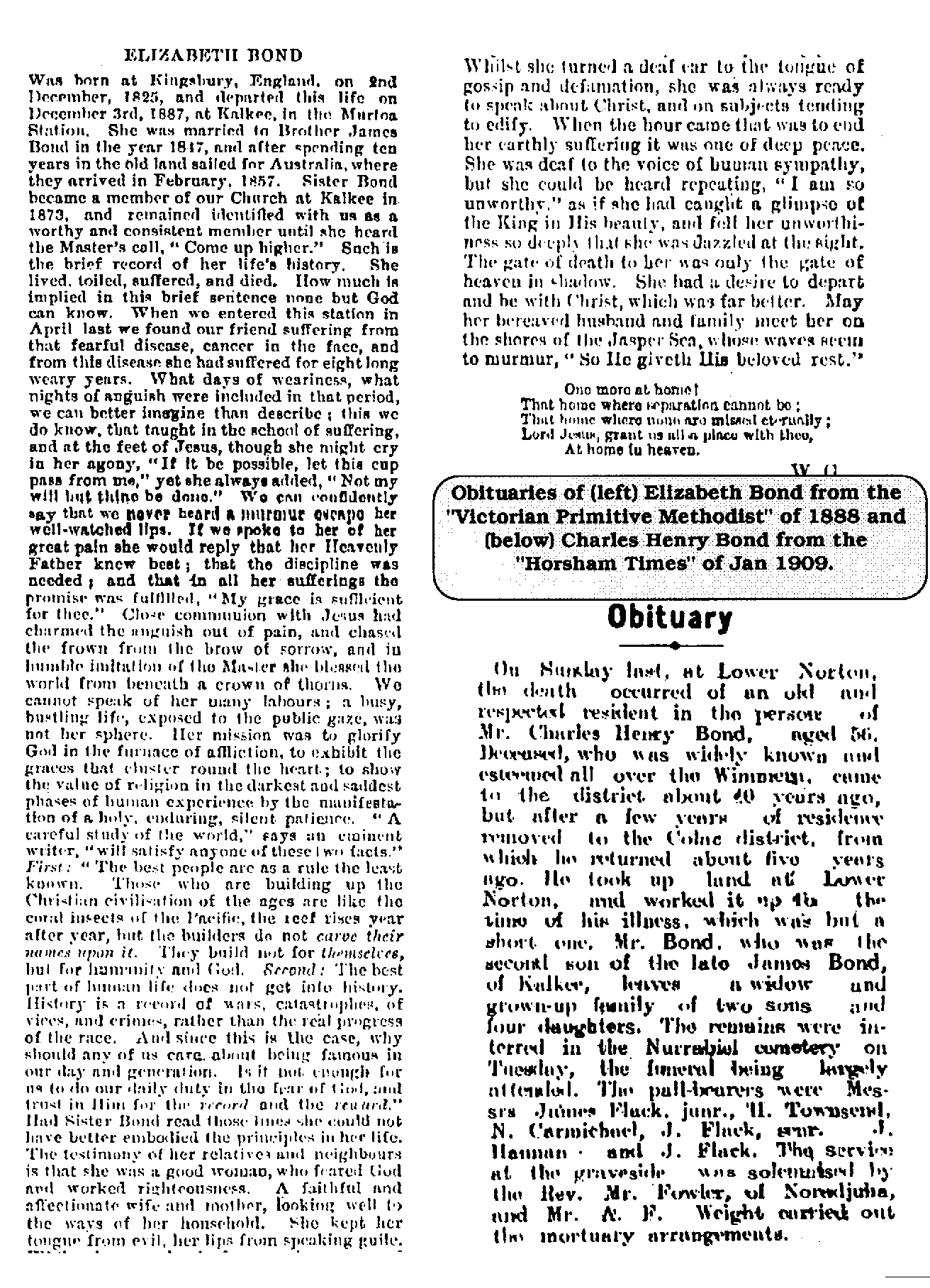 [6] According to the minutes of the meetings of the Trustees of the Nurrabiel Methodist Church a motion was passed on Nov 28th 1889 voting off Mr C.H.Bond as a Trustee as "he has left the district".