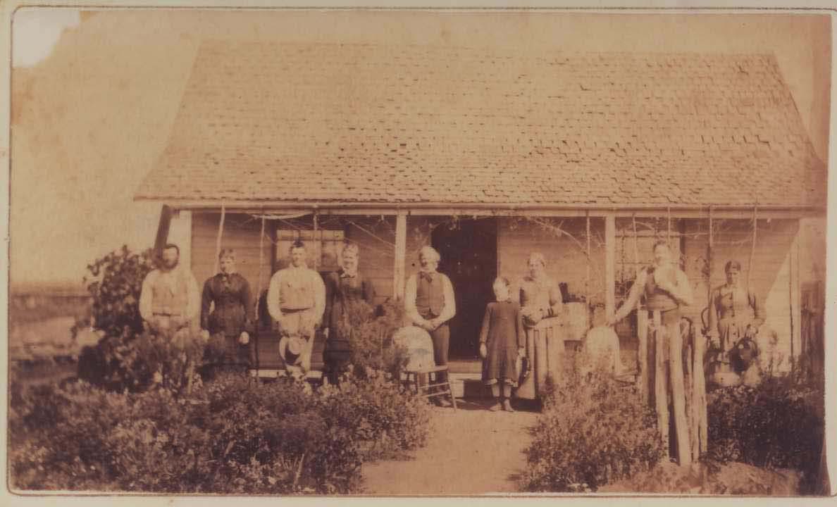 Photograph of James and Elizabeth Bond with seven of their children taken outside their home in Kalkee. Assuming the photograph was taken in the mid 1880's, by which time three of the children were married and one had died, those pictured could be from (l-r) William, Annie, Henry, Elizabeth, James and Elizabeth with Harriett between them then John and Martha.