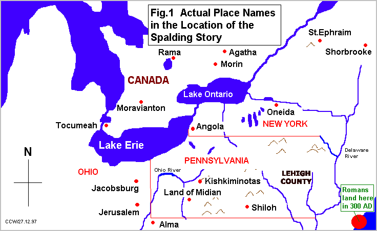 Spaulding lived in this area and had first-hand knowledge of the earthworks, names and geographical locations that are portrayed in his writings. By imposing the Book of Mormon descriptions on maps of these areas, the following modern place names are found to coincide with the cities and lands in the Book of Mormon (see Figs. 1 & 2):30