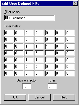 For now, ignore the Division Factor and Bias, and pay attention only to the Filter Matrix. The center cell in the matrix corresponds to the pixel that the filter will affect. The surrounding cells correspond to the pixels surrounding the target pixel. What you'll normally want to do (assuming that the Division Factor is kept at 1 and the Bias at 0) is make sure that the sum of the values in all the cells in the matrix equals 1. This will ensure that the overall brightness of the filtered image is the same as the brightness of the original image. If the sum is less than 1, the filtered image will be darker than the original. If the sum is greater than 1, the filtered image will be brighter. Sometimes you'll want your filter to brighten or darken your images. But keep in mind that if you stray too far from 1, you'll get a filter that turns an image either entirely black or entirely white! So here's our first rule of thumb: Unless otherwise compensated for, keep the matrix sum at 1 to retain the brightness of the original image. And here are two corollaries: To brighten an image, make the matrix sum greater than 1. To see what otherwise compensated for in the first rule of thumb means, let's look at the Sample Blur filter that Jasc includes with PSP: