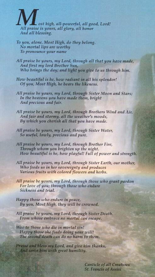 If you want to know why St. Francis of Assisi has been designated the patron of Ecology, you only have to read his beautiful prayer/hymn, "The Canticle of All Creatures".