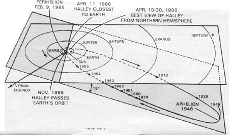 No. The closest that Comet Halley ever came to earth was in the year 837. It came within less than four million miles of the Earth. This was the 15th recorded visit of the comet to the vicinity of earth. In 1910 Halley's Comet came within 13 million miles of the Earth. In 1986 it only came within 38 million miles of Earth. The closest comet to approach Earth was Lexell's comet in 1770, at a distance of 1.39 million miles. Other close encounters were comet IRAS-Iraki-Alock 1983d, at 2.9 million miles, and comet Sugano-Saigusha-Fujikawa 1983e, which came within 8 million miles. Halley's comet doesn't make the list of Earth Grazing Comets! The 1986 return was the thirtieth RECORDED return of Halley's comet (in other words, we have written records of the 76-year returns of the comet beginning in 239 BC. The 1986 return was only the fourth PREDICTED return of Halley's Comet. You see, Edmond Halley saw the comet in 1682 and speculated that it was the same comet that was here in1607 and on previous occasions counting back an average 76 years each time -- and he predicted, based on an analysis of its orbit and the records of previous comets in history, that it would return in 1759. Although he would not be around to see it (he died in 1742), the comet returned in 1759 as predicted, and was from that point on called "Halley's Comet". In other words, Halley made the scientific discovery that comets had elliptical orbits around the sun, and would return periodically depending on the length of their orbit. It came back again on time in 1835, then in 1910, and then again in 1985.