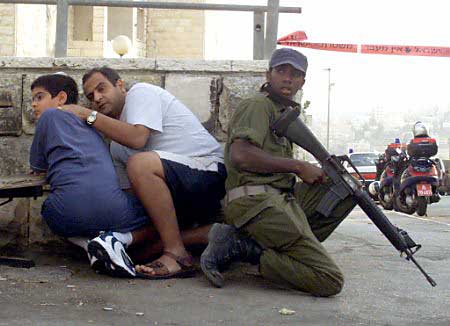 This photo was taken in Jerusalem, near the Temple Mount, by Evelyn Hockstein, a Reuters photographer, on Friday, April 6, 2001. How pathetic, poor little child - why on earth would the Israeli's arrest an 'innocent child' like this? The photo is being used by the Palestinians in their propaganda campaign.
