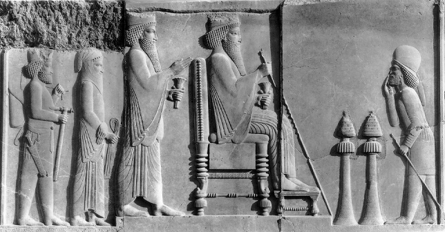 The above bas-relief from Persepolis (Ancient Persia) shows Darius I, the Great who is seated. He is followed by his son, the Crown Prince, Xerxes. Xerxes is depicted in the same size and with his head at the same level as his father's. This indicates not only that Xerxes was the heir apparent, but also co-ruler with his father, Darius.