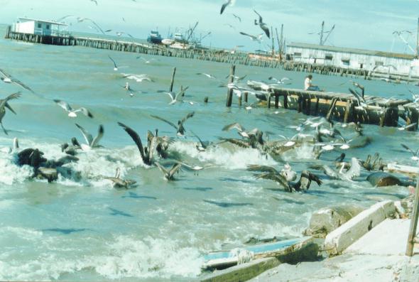 Salida del Arroyo de los Franceses a la Laguna de Términos. A la derecha, pelícanos alimentados desde la costa.